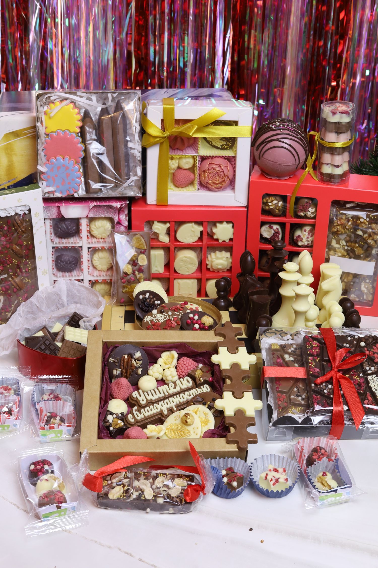 Разрабатываем шоколадные изделия под запрос и нужны клиента. Можем сделать эконом мини подарочки и упаковать во флоупак или большие премиум коробки шоколадных конфет.